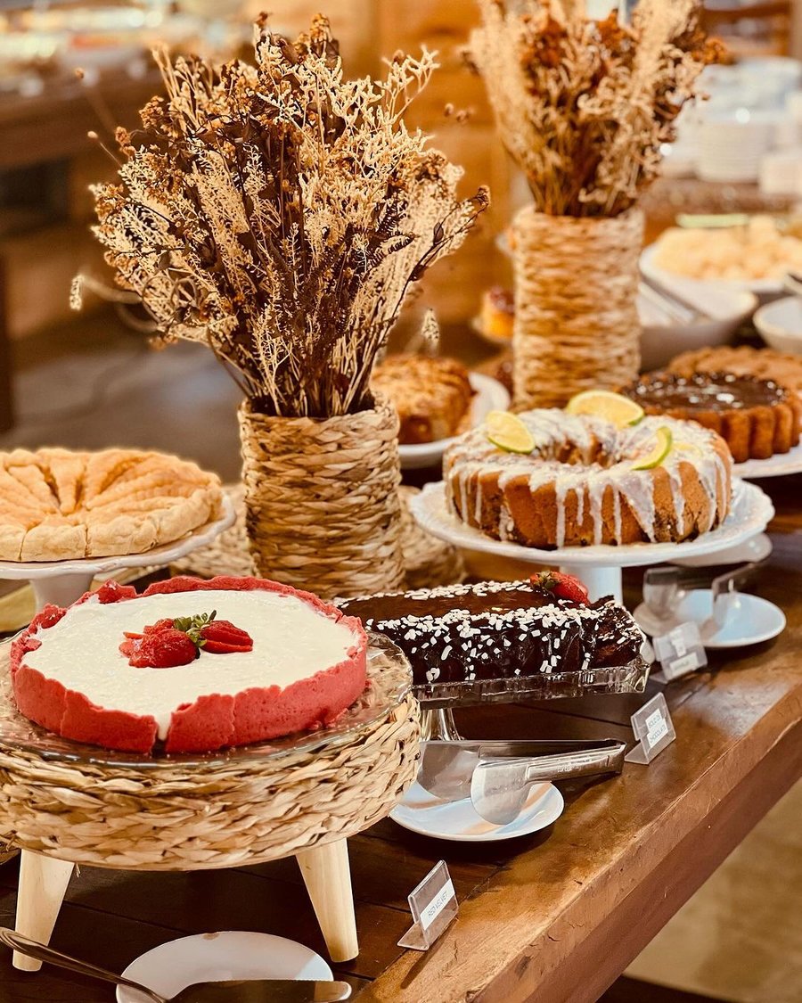 Delicie-se com mais de 80 opções, tudo à vontade, incluindo pães fresquinhos, bolos caseiros, doces tentadores, tortas irresistíveis, frutas da estação, pão na chapa quentinho, tapiocas preparadas na hora e salgados deliciosos direto do fogão a lenha. Para acompanhar, sucos naturais refrescantes, iogurte cremoso, café aromático, chocolate quente, leite, chás variados, cereais, frios e omeletes feitos na hora.