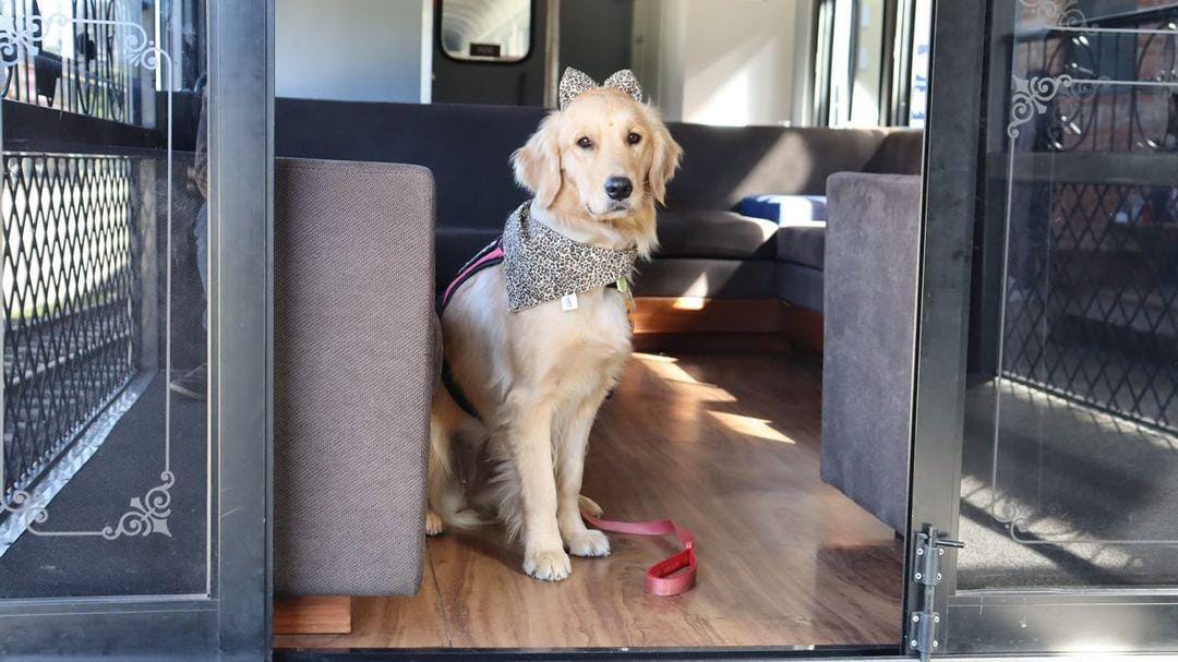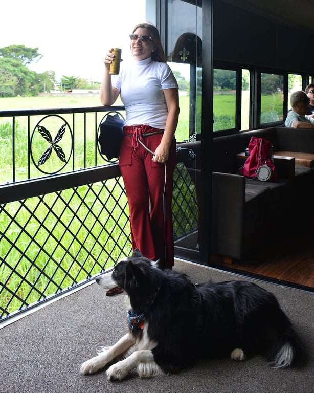 O vagão é pet friendly e adaptado para recebê-los. Possui caminhas especiais nos assentos e uma varanda central com pote de água e piso com borracha reciclável e higiênica.