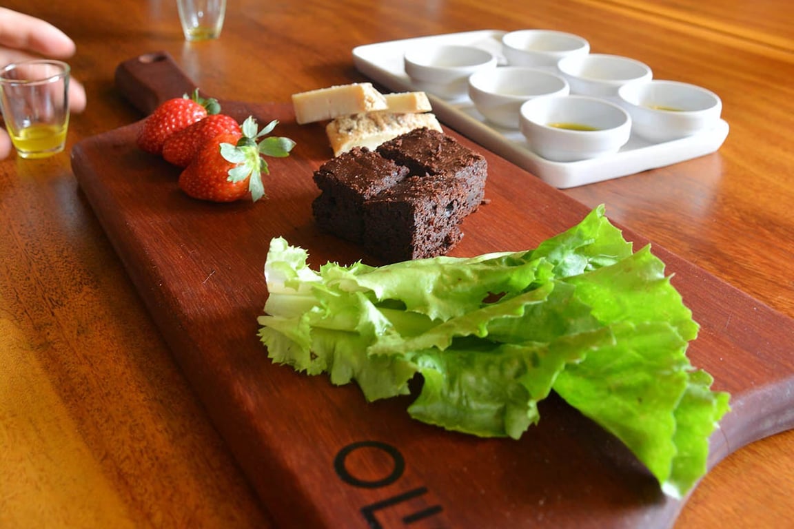 Após a visita, será feita a sessão de degustação. Ao todo é possível experimentar 6 azeites que são harmonizados com diferentes alimentos como queijos, pães, escarola, morango e brownie. Você poderá provar o azeite de oliva com manjericão, azeite de oliva com limão siciliano e até um gelatto feito de azeite.